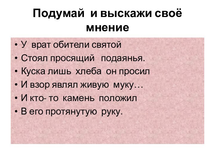 Подумай и выскажи своё мнениеУ врат обители святой Стоял просящий подаянья.Куска