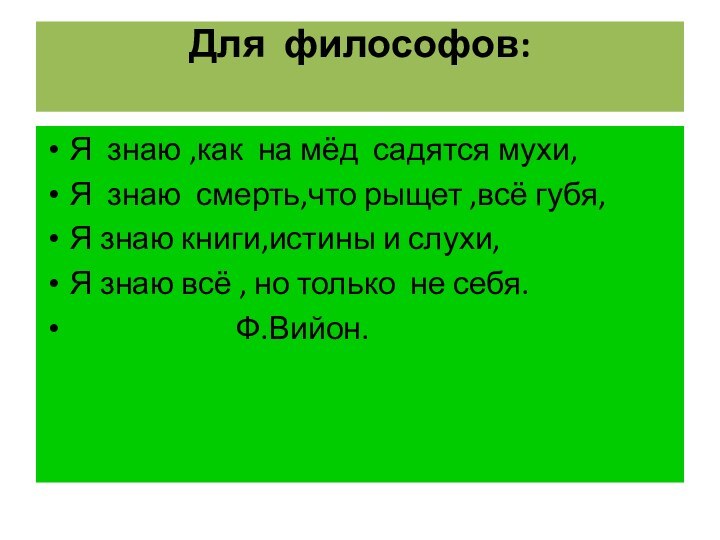 Для философов: Я знаю ,как на мёд садятся мухи,Я знаю смерть,что