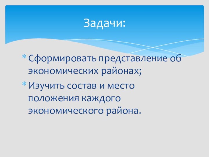 Сформировать представление об экономических районах;Изучить состав и место положения каждого экономического района.Задачи: