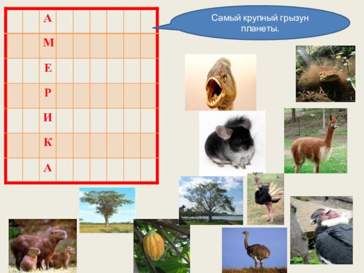 Растительный и животный мир Южной АмерикиКубрикова Н.В., учитель географииМБОУ СОШ № 58 Самый крупный грызун планеты. Неправильно Подумай Копытное животное Анд. Неправильно Подумай Дерево, достигающее высоты 80 м. Неправильно Подумай Кровожадное животное в реке Амазонке. Неправильно Подумай Грызун с ценным мехом. Неправильно Подумай Растение с ценными плодами. Неправильно Подумай Страус Южной Америки. Неправильно Подумай
