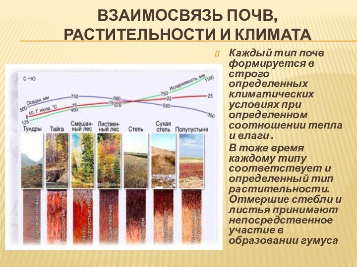В тоже время каждому типу соответствует и определенный тип растительности. Отмершие стебли и листья принимают непосредственное участие в образовании гумуса