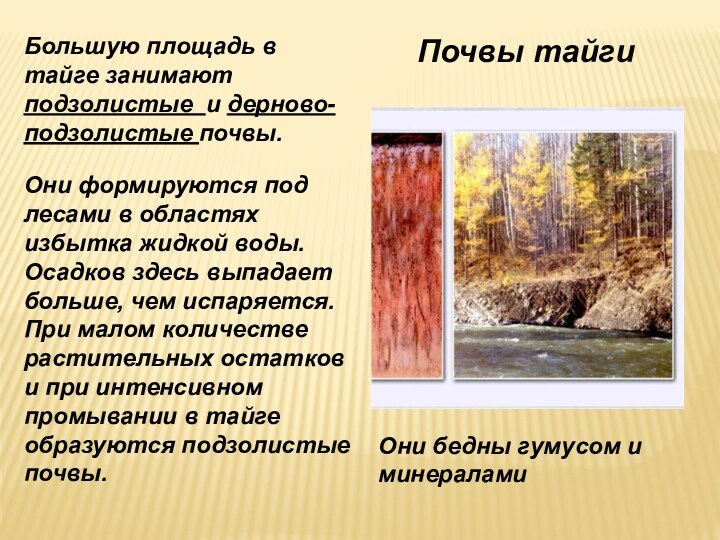 воды. Осадков здесь выпадает больше, чем испаряется. При малом количестве растительных остатков и при интенсивном промывании в тайге образуются подзолистые почвы.