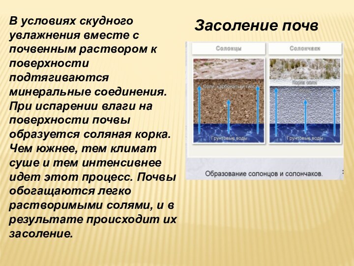 на поверхности почвы образуется соляная корка. Чем южнее, тем климат суше и тем интенсивнее идет этот процесс. Почвы обогащаются легко растворимыми солями, и в результате происходит их засоление.