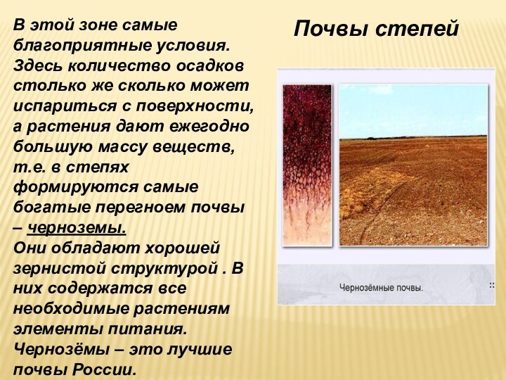 Они обладают хорошей зернистой структурой . В них содержатся все необходимые растениям элементы питания. Чернозёмы – это лучшие почвы России.