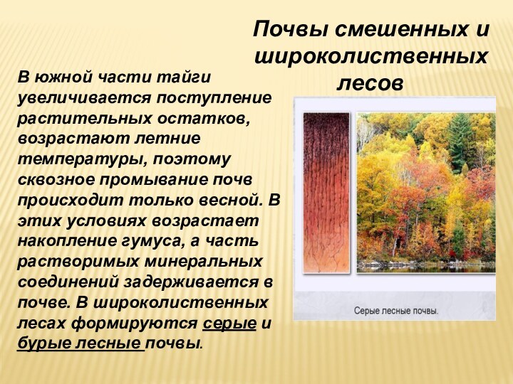 промывание почв происходит только весной. В этих условиях возрастает накопление гумуса, а часть растворимых минеральных соединений задерживается в почве. В широколиственных лесах формируются серые и бурые лесные почвы.