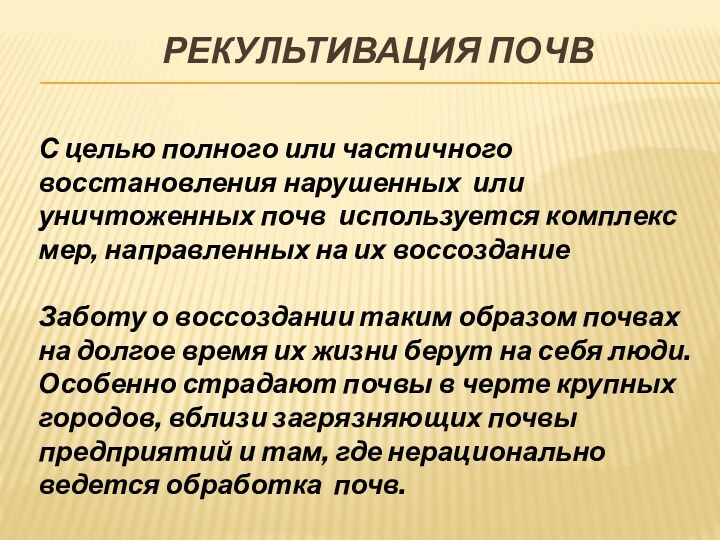 Заботу о воссоздании таким образом почвах на долгое время их жизни берут на себя люди. Особенно страдают почвы в черте крупных городов, вблизи загрязняющих почвы предприятий и там, где нерационально ведется обработка почв.