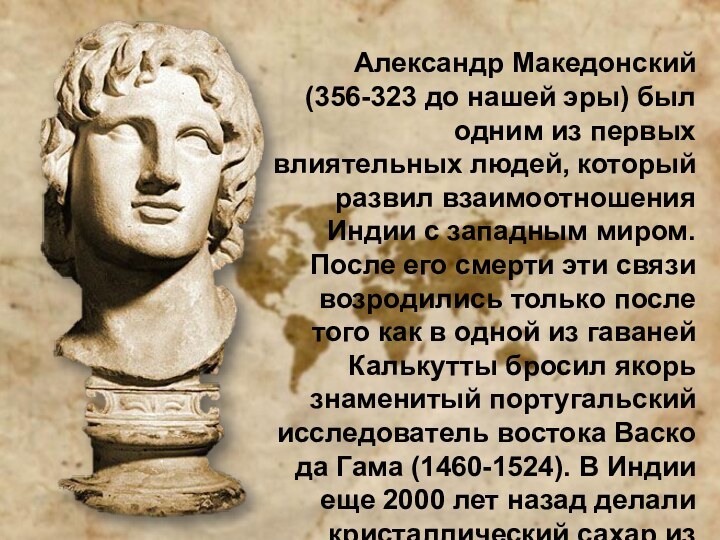 западным миром. После его смерти эти связи возродились только после того как в одной из гаваней Калькутты бросил якорь знаменитый португальский исследователь востока Васко да Гама (1460-1524). В Индии еще 2000 лет назад делали кристаллический сахар из тростника. Когда Александр Македонский добрался до индийской территории, он был удивлен процессом получения меда без использования пчел (то есть, искусственного меда из сахара)