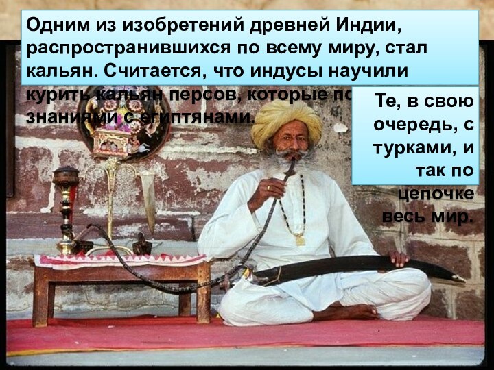 Одним из изобретений древней Индии, распространившихся по всему миру, стал кальян.