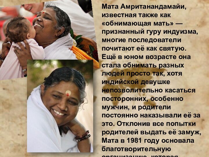 Слайд 34 Мата Амританандамайи, известная также как «обнимающая мать» —