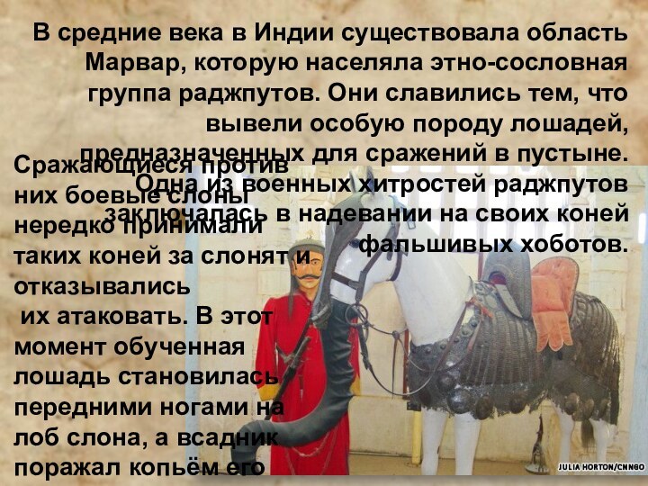 вывели особую породу лошадей, предназначенных для сражений в пустыне. Одна из военных хитростей раджпутов заключалась в надевании на своих коней фальшивых хоботов.
