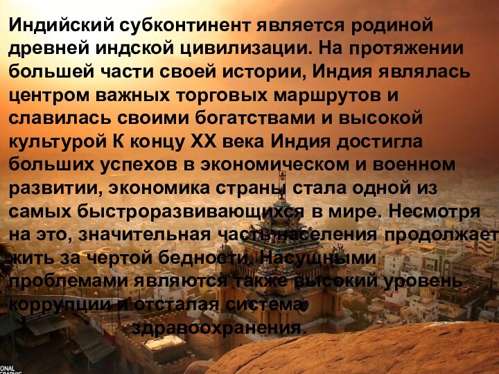 торговых маршрутов и славилась своими богатствами и высокой культурой К концу XX века Индия достигла больших успехов в экономическом и военном развитии, экономика страны стала одной из самых быстроразвивающихся в мире. Несмотря на это, значительная часть населения продолжает жить за чертой бедности. Насущными проблемами являются также высокий уровень