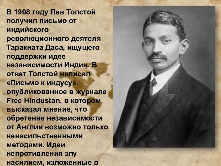 Индии. В ответ Толстой написал «Письмо к индусу», опубликованное в журнале Free Hindustan, в котором высказал мнение, что обретение независимости от Англии возможно только ненасильственными методами. Идеи непротивления злу насилием, изложенные в этой работе и в другой статье писателя «Царство Божие внутри вас», оказали сильное влияние на молодого Махатму Ганди, который впоследствии возглавил националистическое движение Индии и добился её мирного отделения от Англии в 1947 году.
