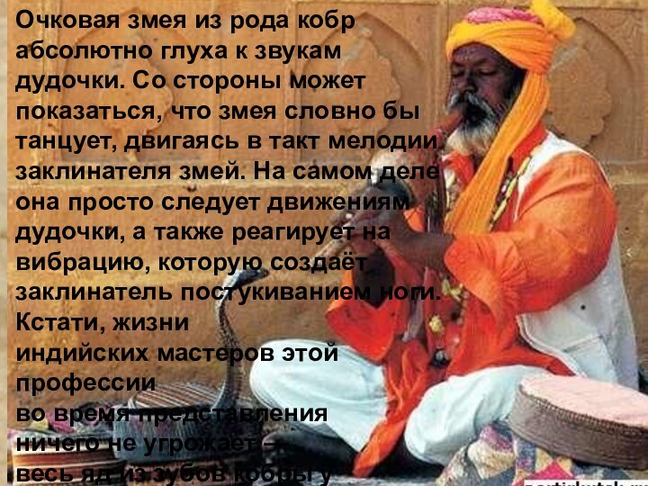 Очковая змея из рода кобр абсолютно глуха к звукам дудочки. Со