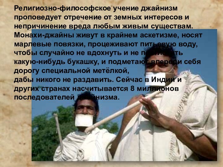 крайнем аскетизме, носят марлевые повязки, процеживают питьевую воду, чтобы случайно не вдохнуть и не проглотить какую-нибудь букашку, и подметают впереди себя дорогу специальной метёлкой,