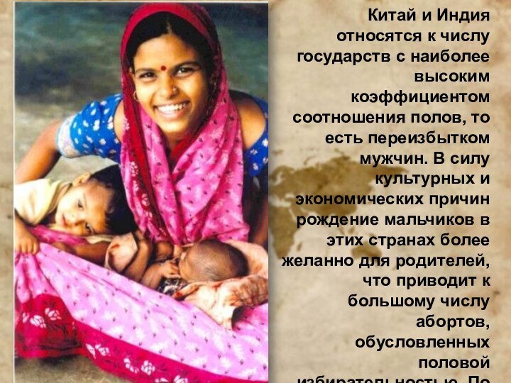 В силу культурных и экономических причин рождение мальчиков в этих странах более желанно для родителей, что приводит к большому числу абортов, обусловленных половой избирательностью. По этой причине и в Китае, и в Индии даже приняты законы, запрещающие определение пола ребёнка до рождения с помощью УЗИ или любого другого способа. Однако запреты показывают малую эффективность, так как нелегально такие услуги доступны любой семье.