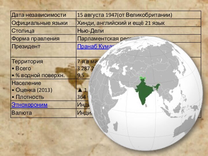 ИнтересныеИндии. фактыобНазвание страны «Индия» происходит от названия реки Инд, так как долины, Индийский флаг имеет три горизонтальных полосы разного цвета: желто-оранжевый посвящен храбрости и Площадь территории  Индии в три раза меньше, чем США, но при этом В 1950 году сборная Индии по футболу снялась с чемпионата мира после Мумбаи (бывший Бомбей) со своими 15 миллионами человек является самым большим городом На северо-востоке Индии издавна пользовались мостами, выросшими естественным образом. Для этого использовалась Танцы являются наиболее развитым видом искусства в Индии и являются составной частью Многие индийские женщины никогда не произносят имя своего мужа вслух, так как Быть вдовой считается плохим знаком, у хорошей жены муж бы не умер. Издавна в Индии был распространён обычай сати — самосожжение вдовы на погребальном Китай и Индия относятся к числу государств с наиболее высоким коэффициентом соотношения У народа апатани, проживающего в Индии, до 1970-х годов сохранялась традиция вставлять В средние века в Индии существовала область Марвар, которую населяла этно-сословная группа Индия является родиной шахмат. Когда-то они назывались «чатуранга», что означает в переводе В Индии 150 000 почтовых отделений, что делает сеть по доставке почтовых В Индии 19 века почтальоны носили длинные палки с привязанными к их Александр Македонский (356-323 до нашей эры) был одним из первых влиятельных людей, Одним из изобретений древней Индии, распространившихся по всему миру, стал кальян. Считается, Бенгальский тигр всегда был национальным символом Индии, и когда-то он встречался практически Коровы свободно расхаживают по улицам индийских городов. Они считаются здесь священными и Между прочим, в Индии живет третье по величине мусульманское население в мире Религиозно-философское учение джайнизм проповедует отречение от земных интересов и непричинение вреда любым В некоторых индийских деревнях существует ритуал сбрасывать новорожденных с крыши храма. Например, Храм Лотоса в Индии является одним из наиболее посещаемых храмов в мире, В городке Дешноке в западной Индии находится храм Карни Мата, построенный в Британское владычество над Индией длилось с 1858 по 1947 год, хотя англичане В 1857 году англичане привезли дальнобойные винтовки «Энфилд» для вооружения индийской армии. Однажды англичане во время колониальной оккупации в Индии решили сократить численность расплодившихся Очковая змея из рода кобр абсолютно глуха к звукам дудочки. Со стороны В 1908 году Лев Толстой получил письмо от индийского революционного деятеля Таракната Мохандас K. Gandhi (1869-1948), известен во всем мире как Махатма Ганди, что В 1944 году в возрасте 72 лет жена Махатмы Ганди Кастурба заболела Мата Амританандамайи, известная также как «обнимающая мать» — признанный гуру индуизма, многие Законом запрещено вывозить или ввозить  в страну индийскую валюту (рупии).Индия является лидером Индийский субконтинент является родиной древней индской цивилизации. На протяжении большей части своей СПАСИБО ЗА ВНИМАНИЕ!Феер Наталья, 11 «А»