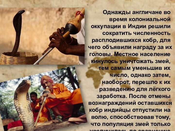 за их головы. Местное население кинулось уничтожать змей, тем самым уменьшив их число, однако затем, наоборот, перешло к их разведению для лёгкого заработка. После отмены вознаграждений оставшихся кобр индийцы отпустили на волю, способствовав тому, что популяция змей только увеличилась по сравнению с исходным значением. С тех пор выражение «эффект кобры» закрепилось за любыми действиями, направленными на решение проблемы, но в результате ухудшающих её.