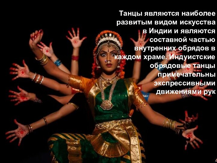 Слайд 8 Танцы являются наиболее развитым видом искусства в Индии