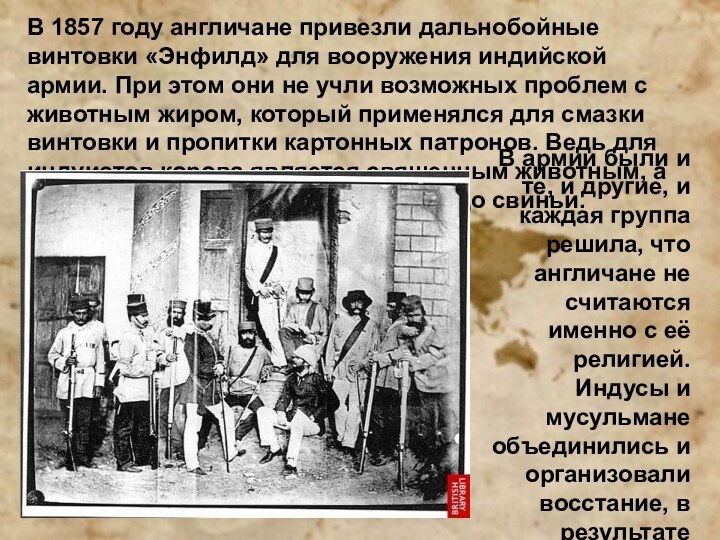 В 1857 году англичане привезли дальнобойные винтовки «Энфилд» для вооружения индийской