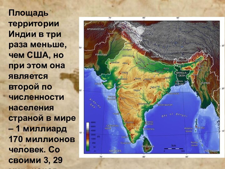 населения страной в мире – 1 миллиард 170 миллионов человек. Со своими 3, 29 миллионов квадратных километров она является седьмой по величине страной мира.