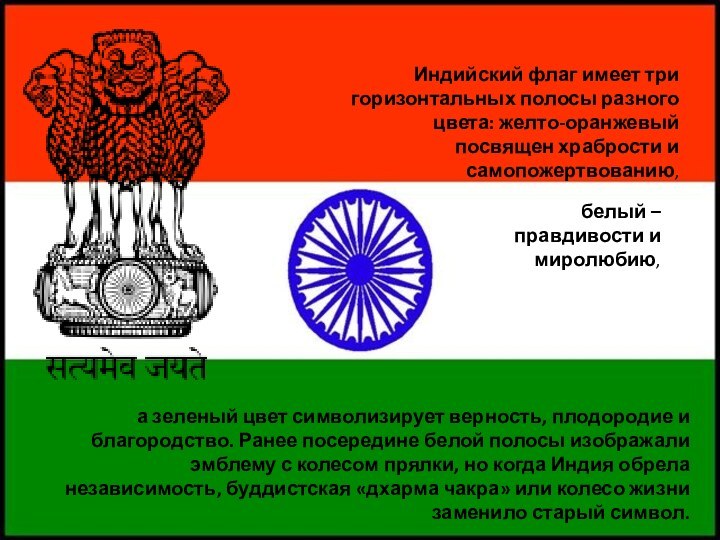 верность, плодородие и благородство. Ранее посередине белой полосы изображали эмблему с колесом прялки, но когда Индия обрела независимость, буддистская «дхарма чакра» или колесо жизни заменило старый символ.