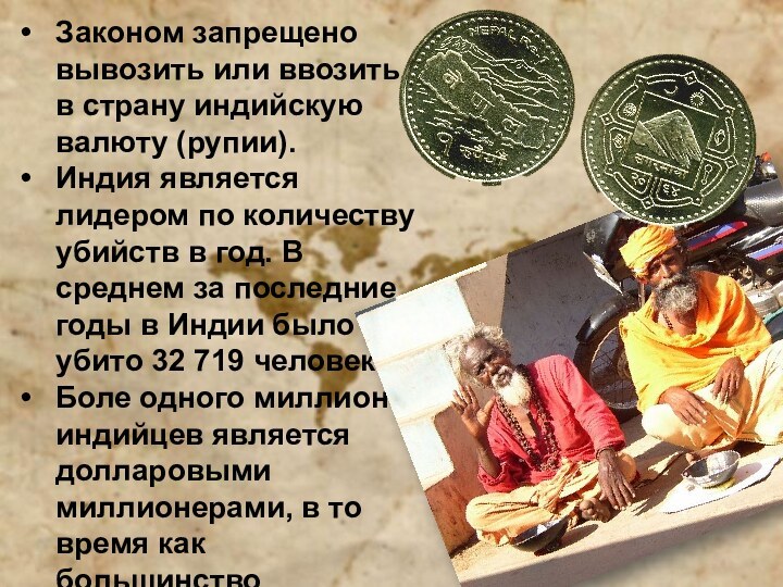 Законом запрещено вывозить или ввозить  в страну индийскую валюту (рупии).Индия является