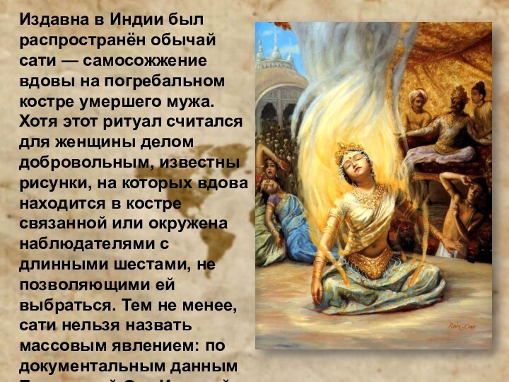 Издавна в Индии был распространён обычай сати — самосожжение вдовы на