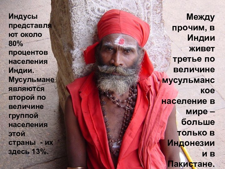 Индусы представляют около 80% процентов населения Индии. Мусульмане являются второй по величине группой населения этой страны  - их здесь 13%.