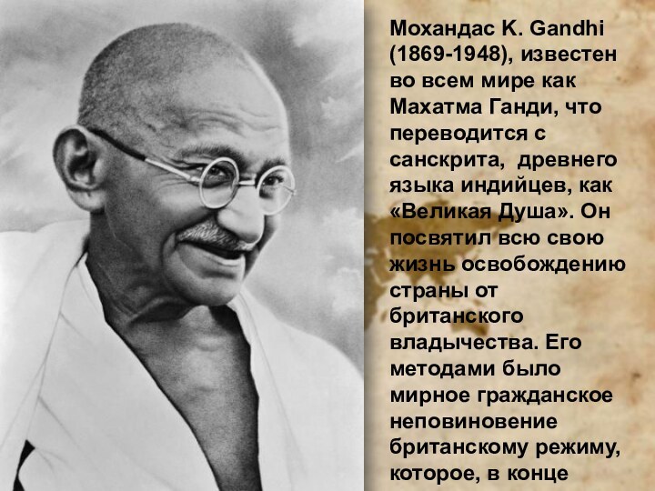 индийцев, как «Великая Душа». Он посвятил всю свою жизнь освобождению страны от британского владычества. Его методами было мирное гражданское неповиновение британскому режиму, которое, в конце концов, привело к освобождению Индии. 2 октября, день рождения Махатмы Ганди является национальным праздником Индии. Он был убит в 1948 году – на следующий год после освобождения родной страны.
