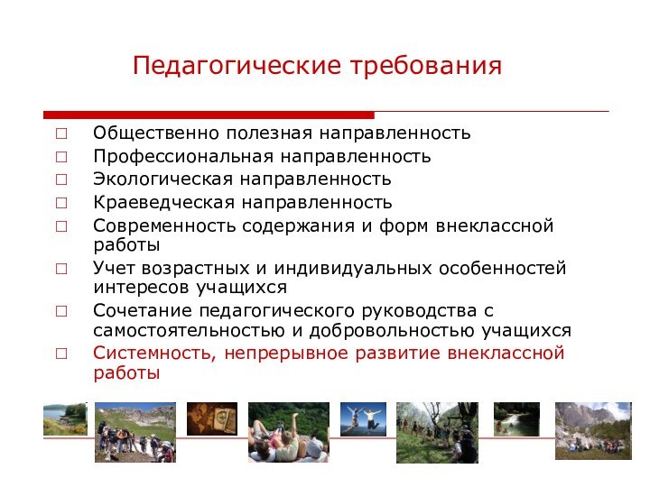 интересов учащихся Сочетание педагогического руководства с самостоятельностью и добровольностью учащихся Системность, непрерывное развитие внеклассной работы