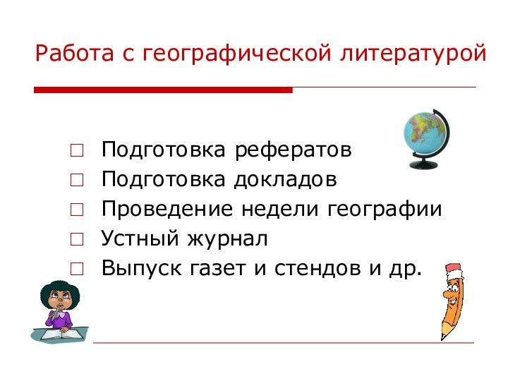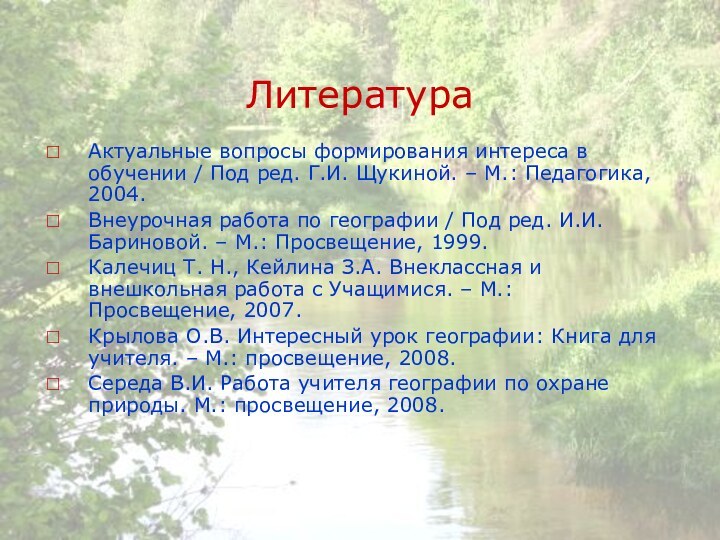 географии / Под ред. И.И. Бариновой. – М.: Просвещение, 1999. Калечиц Т. Н., Кейлина З.А. Внеклассная и внешкольная работа с Учащимися. – М.: Просвещение, 2007. Крылова О.В. Интересный урок географии: Книга для учителя. – М.: просвещение, 2008. Середа В.И. Работа учителя географии по охране природы. М.: просвещение, 2008.