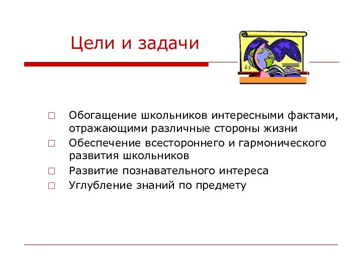 Цели и задачиОбогащение школьников интересными фактами, отражающими различные стороны жизниОбеспечение всестороннего и гармонического развития школьниковРазвитие познавательного интересаУглубление знаний по предмету