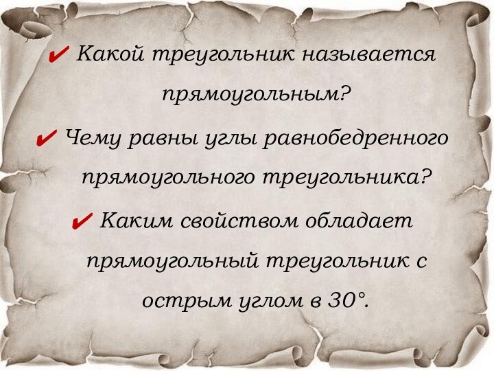 Какой треугольник называется прямоугольным?Чему равны углы равнобедренного прямоугольного треугольника?Каким свойством обладает прямоугольный треугольник с острым углом в 30°.