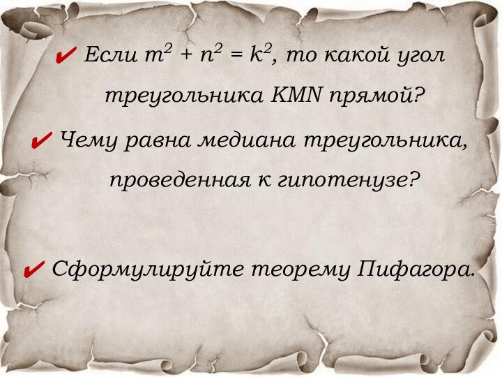 Если m2 + n2 = k2, то какой угол треугольника KMN