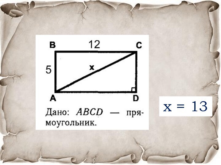 Работаем устно Какой треугольник называется прямоугольным?Чему равны углы равнобедренного прямоугольного треугольника?Каким свойством обладает прямоугольный Если m2 + n2 = k2, то какой угол треугольника KMN прямой?Чему х - ?х = 13 х - ?х = 5 ABCD1512S - ?S = 108