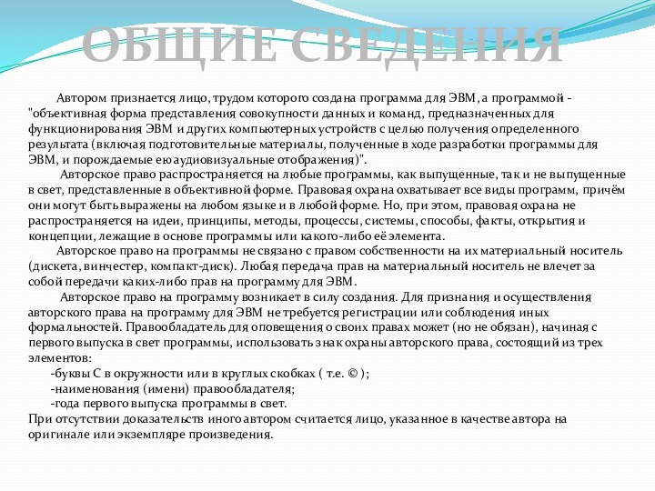 Авторское право на программы не связано с правом собственности на их материальный носитель (дискета, винчестер, компакт-диск). Любая передача прав на материальный носитель не влечет за собой передачи каких-либо прав на программу для ЭВМ.