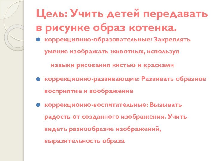 коррекционно-воспитательные: Вызывать радость от созданного изображения. Учить видеть разнообразие изображений, выразительность образа