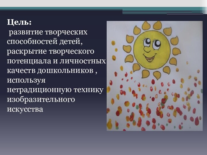 Цель: развитие творческих способностей детей, раскрытие творческого потенциала и личностных качеств дошкольников , используя нетрадиционную технику изобразительного искусства