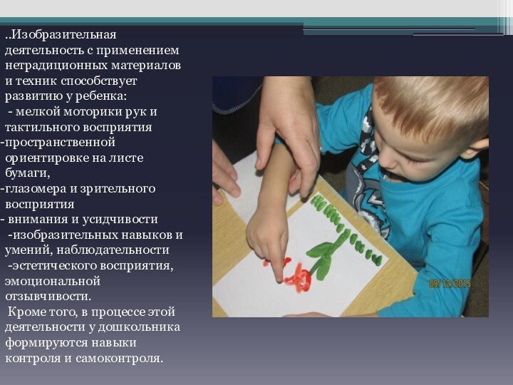 тактильного восприятия пространственной ориентировке на листе бумаги, глазомера и зрительного восприятия внимания и усидчивости -изобразительных навыков и умений, наблюдательности -эстетического восприятия, эмоциональной отзывчивости. Кроме того, в процессе этой деятельности у дошкольника формируются навыки контроля и самоконтроля.