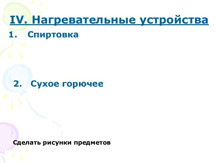 IV. Нагревательные устройстваСпиртовка2. Сухое горючееСделать рисунки предметов