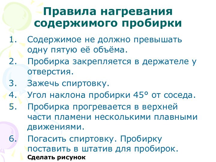 Правила нагревания содержимого пробиркиСодержимое не должно превышать одну пятую её объёма.Пробирка