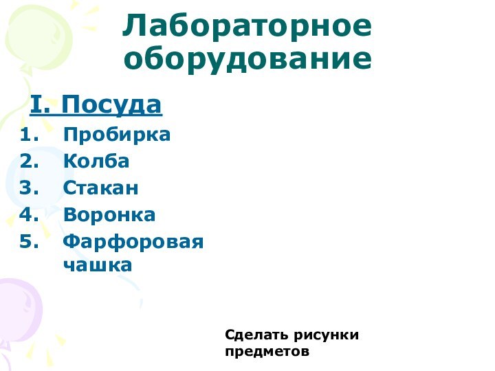 Лабораторное оборудованиеI. ПосудаПробиркаКолбаСтаканВоронкаФарфоровая чашкаСделать рисунки предметов
