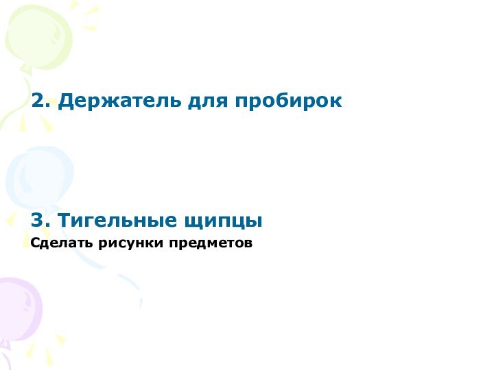 2. Держатель для пробирок3. Тигельные щипцыСделать рисунки предметов