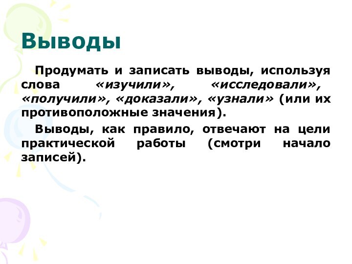 ВыводыПродумать и записать выводы, используя слова «изучили», «исследовали», «получили», «доказали», «узнали»