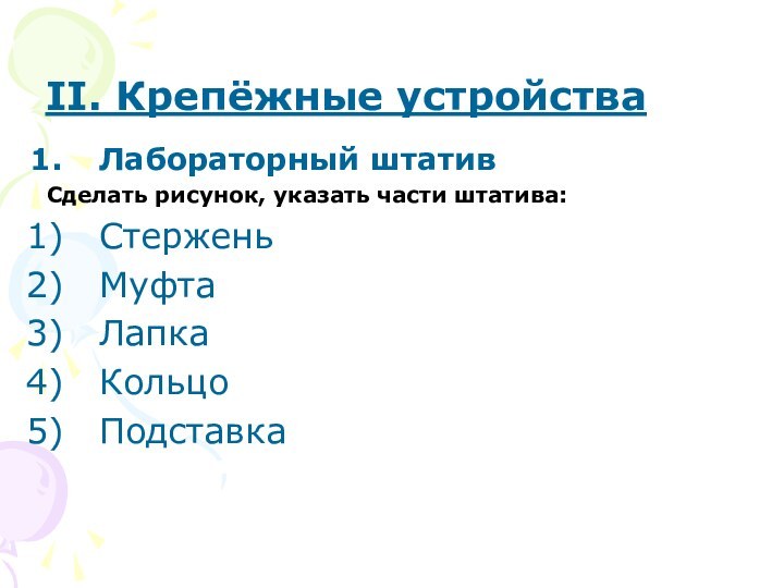 II. Крепёжные устройстваЛабораторный штативСделать рисунок, указать части штатива:СтерженьМуфтаЛапкаКольцо Подставка