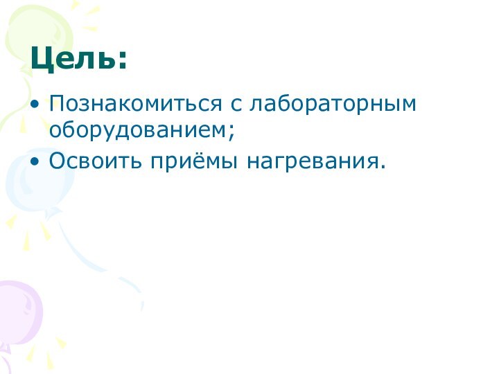 Цель:Познакомиться с лабораторным оборудованием;Освоить приёмы нагревания.