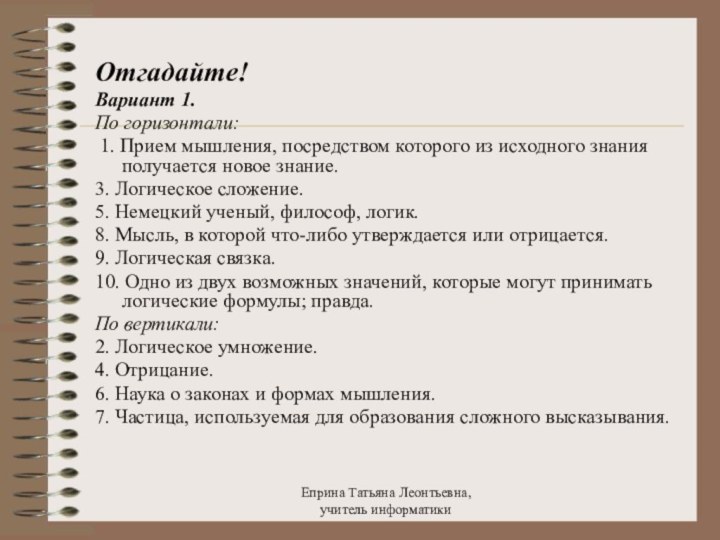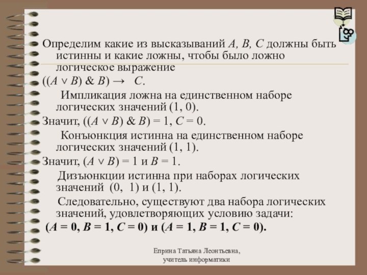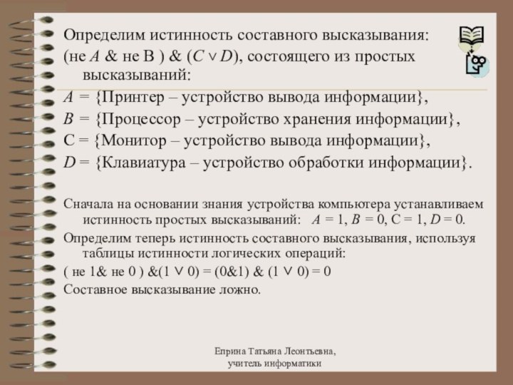 Сначала на основании знания устройства компьютера устанавливаем истинность простых высказываний: А = 1, В = 0, С = 1, D = 0.