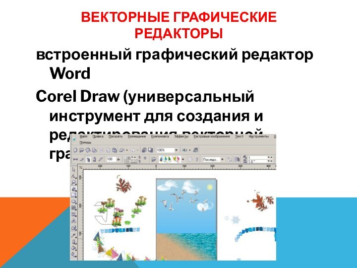 ВЕКТОРНЫЕ ГРАФИЧЕСКИЕ РЕДАКТОРЫвстроенный графический редактор WordCorel Draw (универсальный инструмент для создания и редактирования векторной графики)