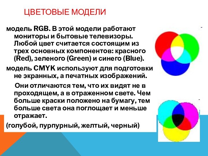 ЦВЕТОВЫЕ МОДЕЛИмодель RGB. В этой модели работают мониторы и бытовые телевизоры.