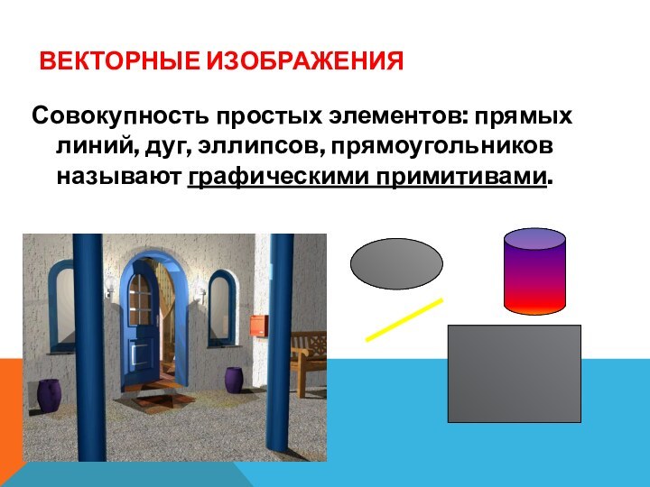 ВЕКТОРНЫЕ ИЗОБРАЖЕНИЯСовокупность простых элементов: прямых линий, дуг, эллипсов, прямоугольников называют графическими примитивами.